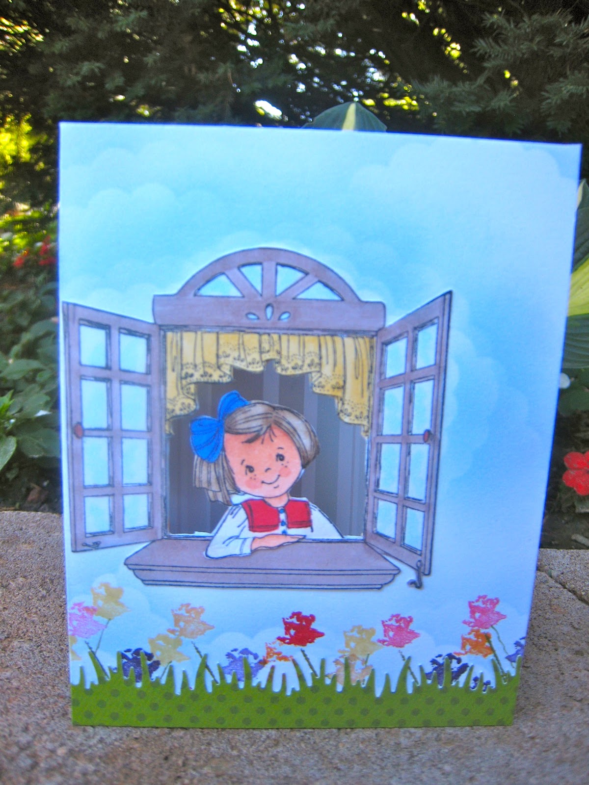 When my stamping group met in DesMoines this summer Annie, who lives in Canada could not be with us in body but she was sure there in spirit. She sent a packet of goodies for everyone. In my packet was this stamp off of front and backs. I had seen these before but never had made one. Oh it was fun! It took me forever to really figure it out. Each time I thought I had it figured out I realized what I had done wasn't going to work. In time I got it right and really like how it turned out. I colored her with my Copics of course and used some old paper from my stash for the wallpaper.