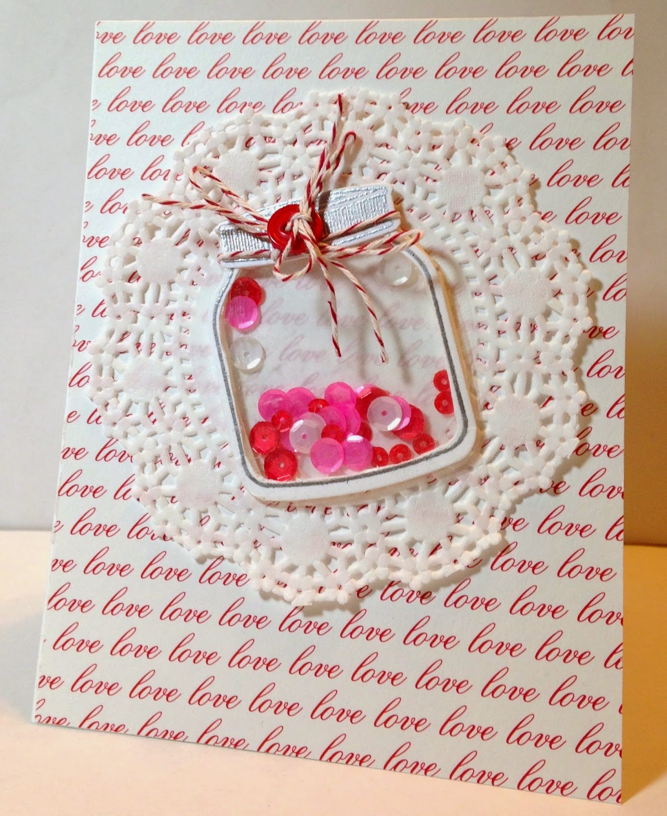 A couple more valentines to share today. The first one is a shaker card I sent to a friend. I think she has it by now but I haven't heard yet. Hope if she doesn't she gets it before she sees it here! I used some old paper in my stash, the jar from Papertrey Ink, sequins from Pretty Pink Posh, a doily from Michaels, and some twine from ???